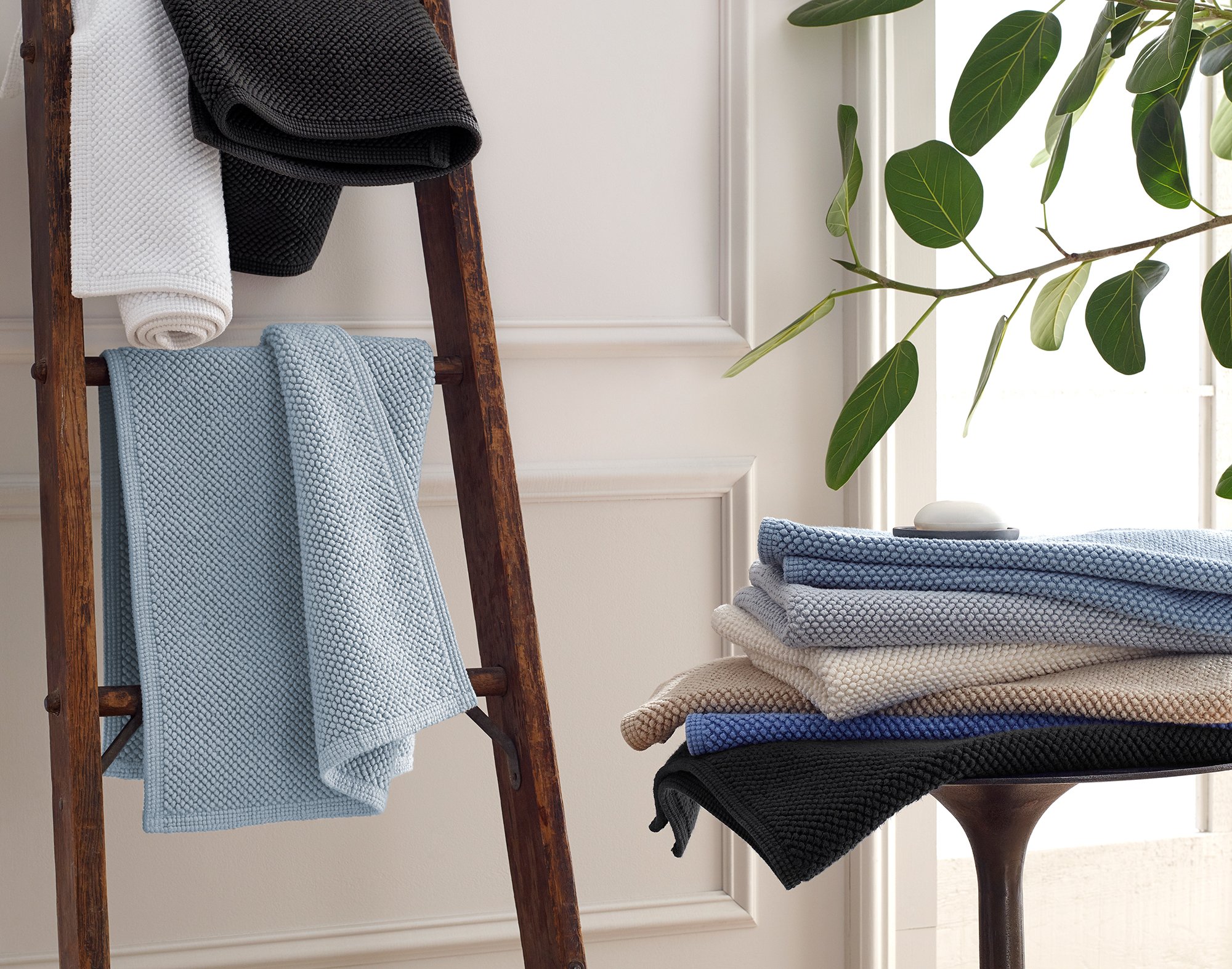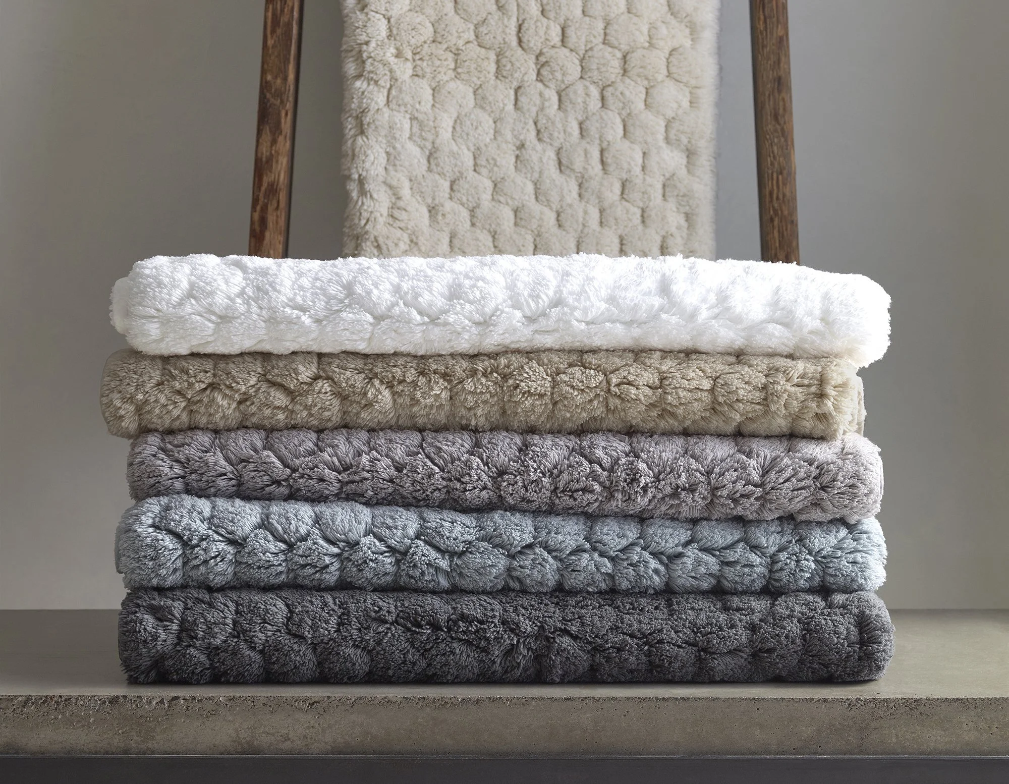 Our assortment offers deep, plush piles, sculpted textures and patterns, and refined colors that coordinate beautifully with our bath linen styles. 100% cotton makes each rug wonderfully soft and absorbent, and most rugs are backed with long-lasting non-slip dots.