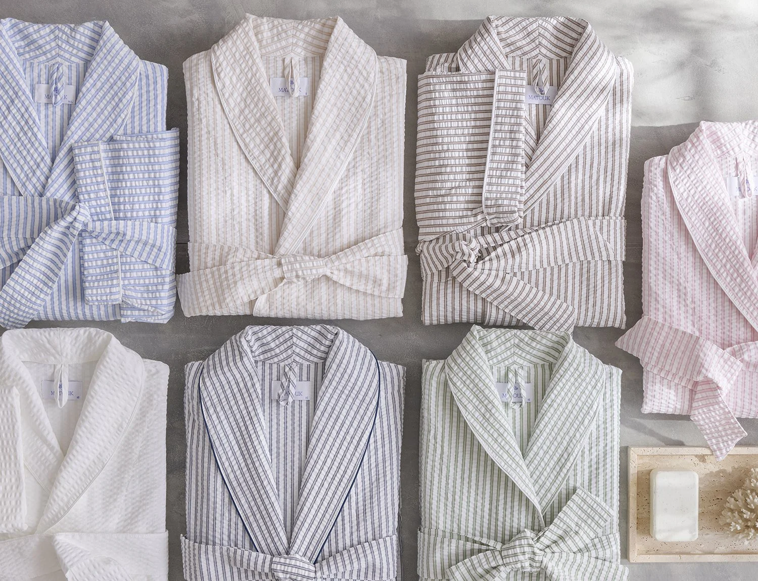 Lightweight and elegant seersucksr adds a hint of sophistication with a neutral, two-toned stripe evocative of classic menswear.